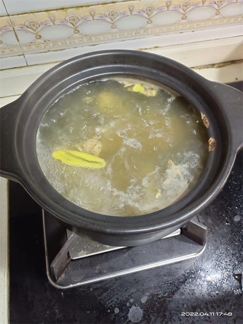 3.水开后转小火,最小火,倒入泡发好的蘑菇,加一点点底盐让肉入味,一定不能加多,否则汤会咸。小火炆2-3小时。蘑菇本身带鲜味,后期只需要加盐调味就行。如果没有砂锅,可以用高压锅代替,时间可以控制在20分钟左右就好。出锅前可以撒入一把枸杞。