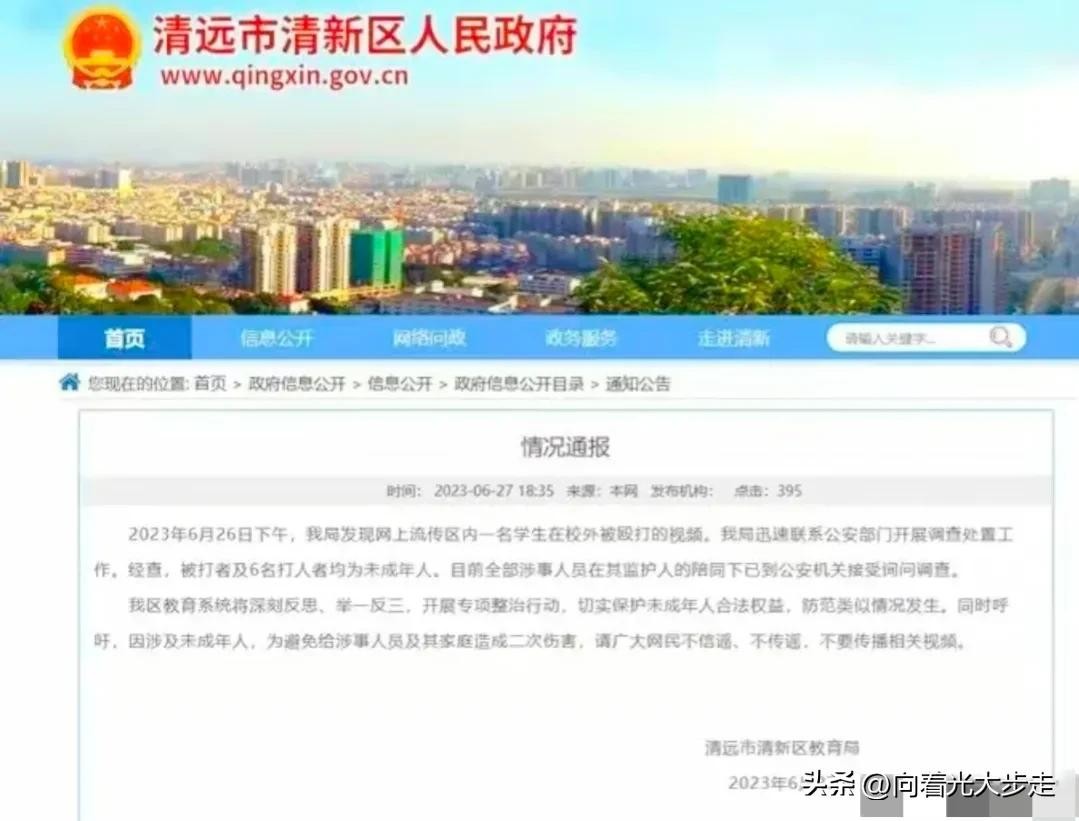 通报主要内容,6月26日下午,局里发现网传视频是区内6名未成年在校外殴打女生一事。迅速联系警方,涉事人员及监护人一同前往警方接受询问调查。表示要举一反三,开展整治行动,并呼吁大家为保障未成年权益,不要造成二次伤害,不要传播视频,不信谣、不传谣等!