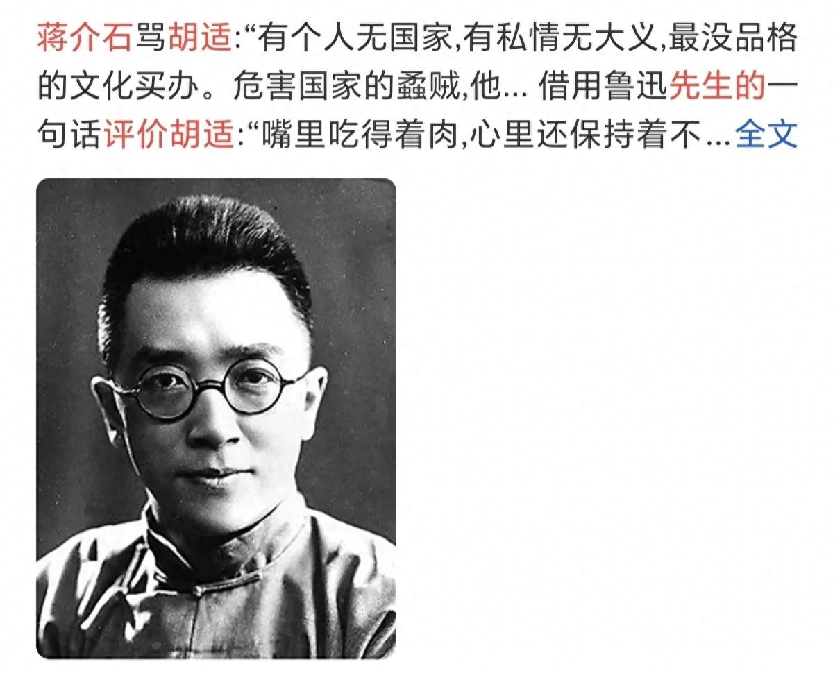 在后来的抗日战争中,胡适一直在售卖他的投降主义理论。他曾公开说过,“我情愿亡国。”,“决不主张对日作战。”他的这些言论,现在还白纸黑字地长在他的全集中!