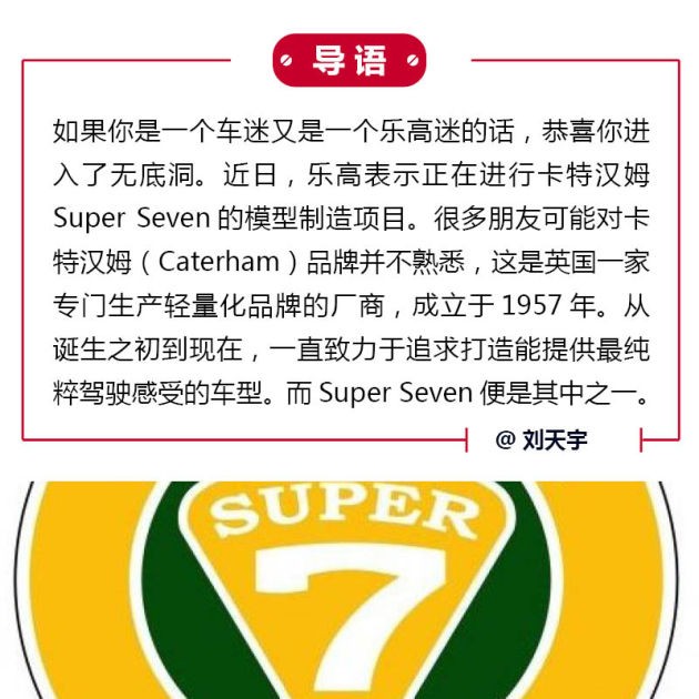 得益于Carl Greatrix的点子,拼装卡特汉姆Super Seven车型被乐高正式采纳。目前乐高的创新模式是,如果设计者的点子获得超过10000人的支持,那么模型将进入乐高的项目审核阶段,然后经过乐高员工的审核,一经通过,便可以正式批量生产。