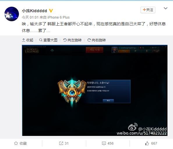而同一时间,Kid最近虽然在韩服登上王者, 却因IG的战绩不佳也萌生退意: