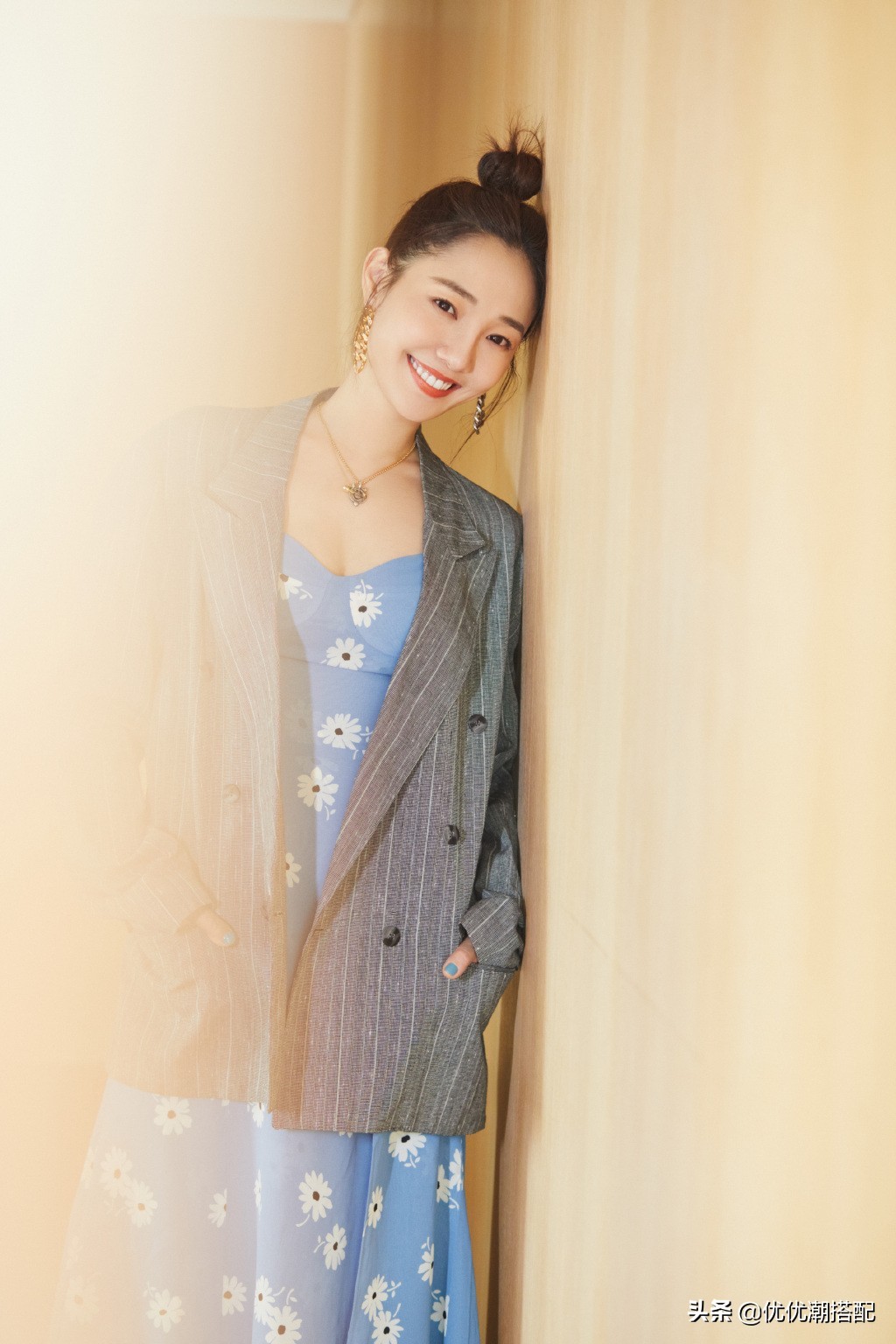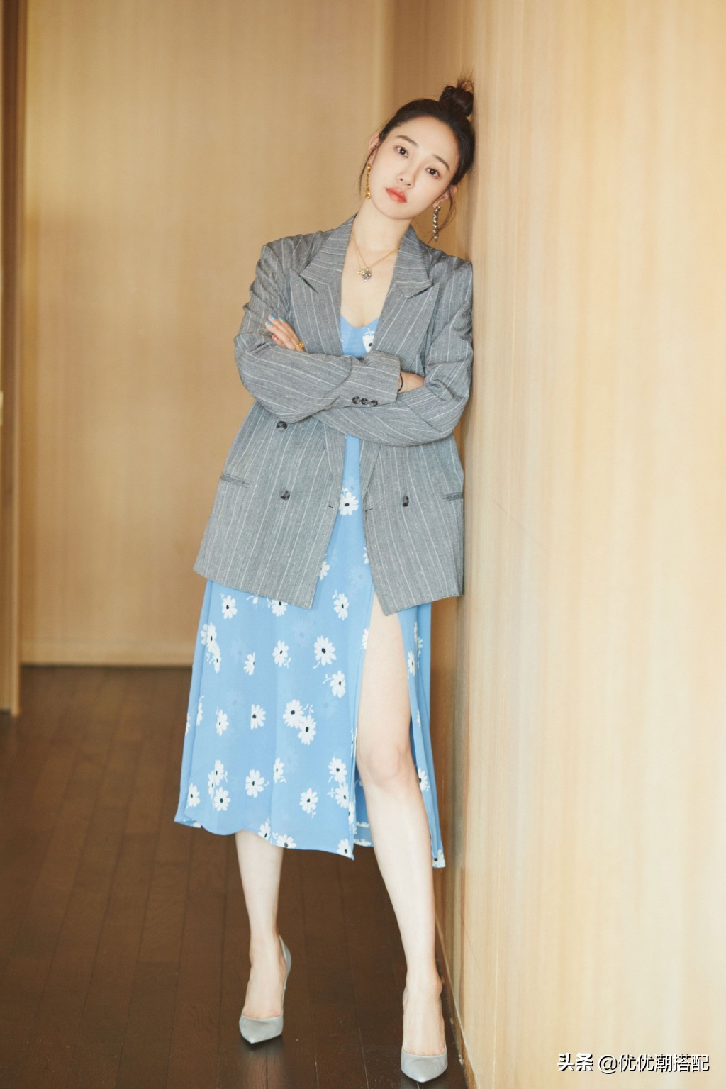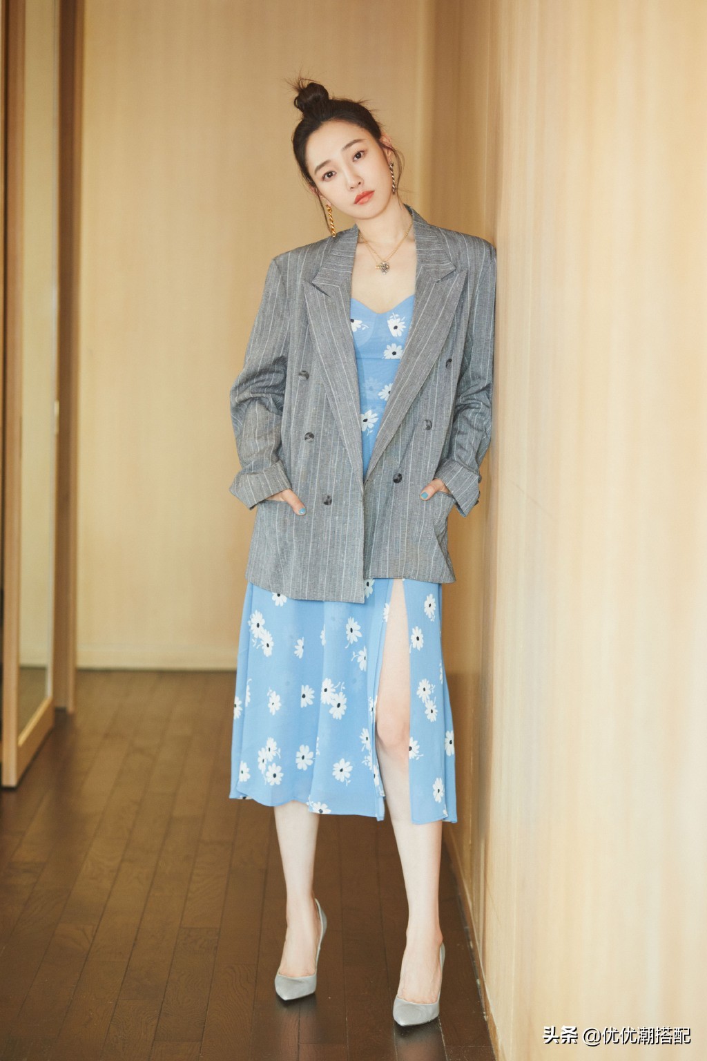 灰色西服与蓝色吊带裙的搭配,高级感十足,把干练和柔美完美的相互融合,碰撞出精彩的火花。外表男友力爆棚,内心却极度温柔,产生极大的反差和冲击力,吸睛力爆表,魅力四射。