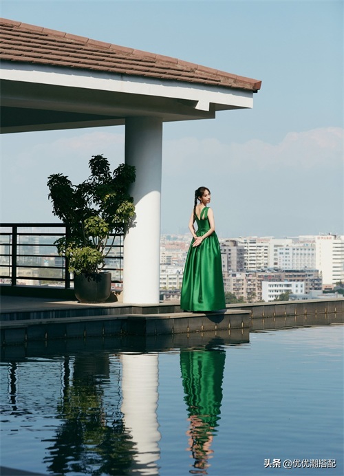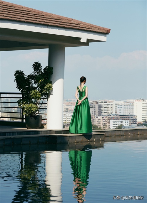 白百何扮嫩简直了!穿复古绿色长裙秀好身材,泳池边拍写真引回忆