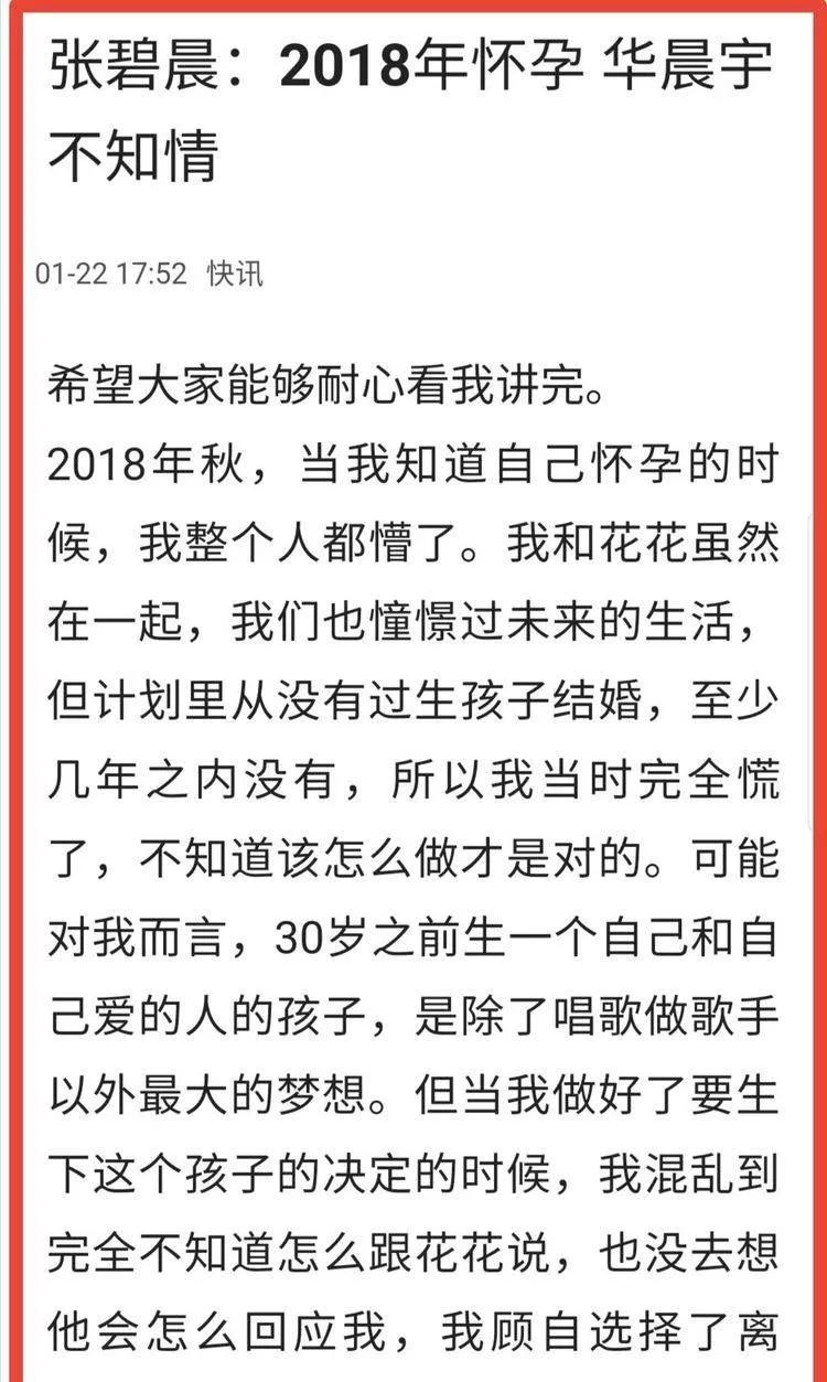 后来张碧晨曾发布一个长文,解释了自己怀孕但不知所措,她希望在自己30岁以前可以找到自己心爱的人并且生下孩子,但是她与华晨宇恋爱时并没有要孩子的打算,所以她选择了隐瞒花花,独自生下了这个孩子。