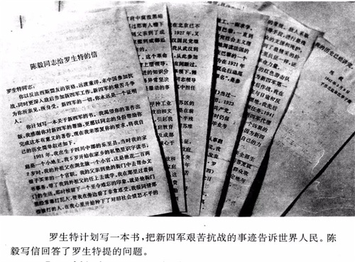 在新四军,罗生特见到了陈毅、刘少奇等新四军的高级将领。此时的他还有一个想法,就是要用自己的亲身经历,写一本有关真实的共产党和它的领导人的书,把它介绍到全世界。他也的确做了大量的工作,他采访了新四军的大批高级将领,后来到山东,他也做了大量的采访,积累了丰富的一手资料。