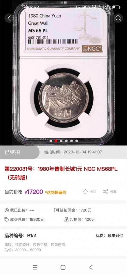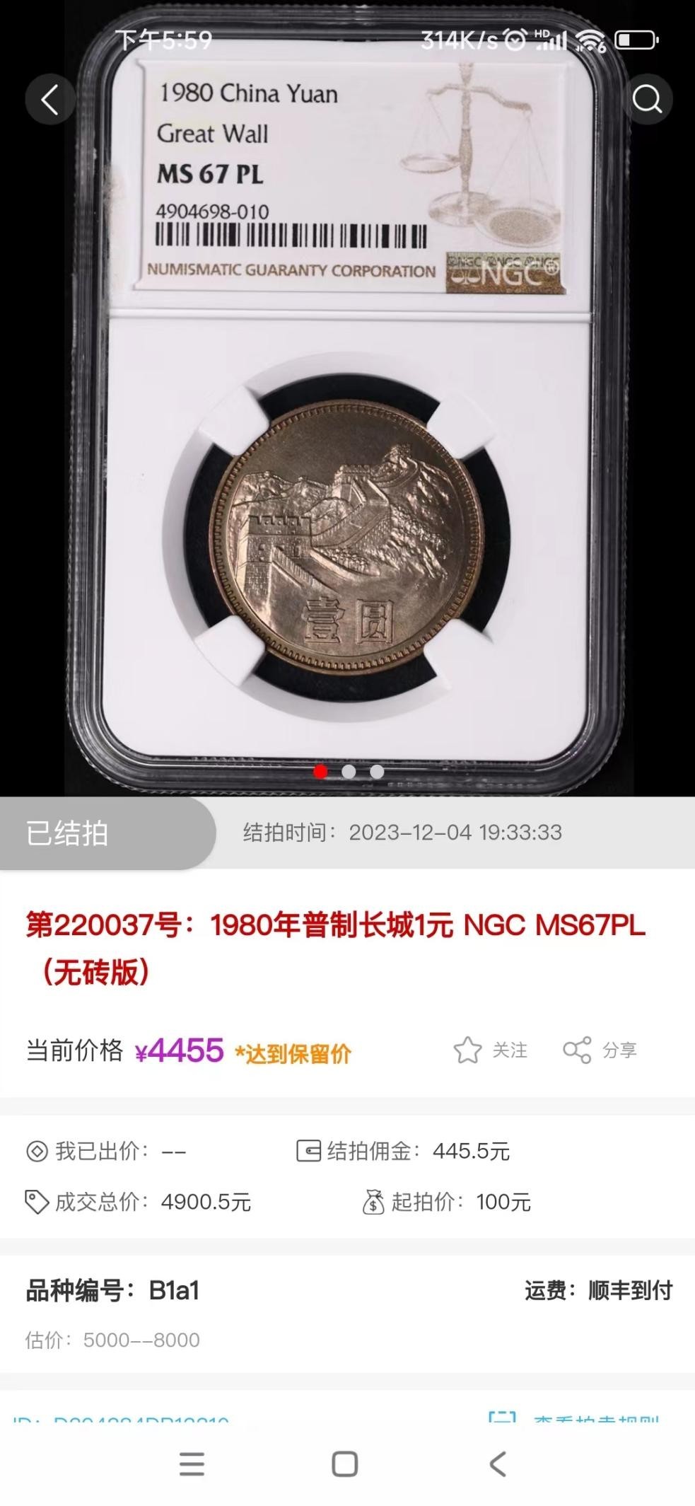 在本篇文章里,把1980年长城币按评级情况分为三类,第一类;带有镜面的PL级,我们来看一下它的成交。