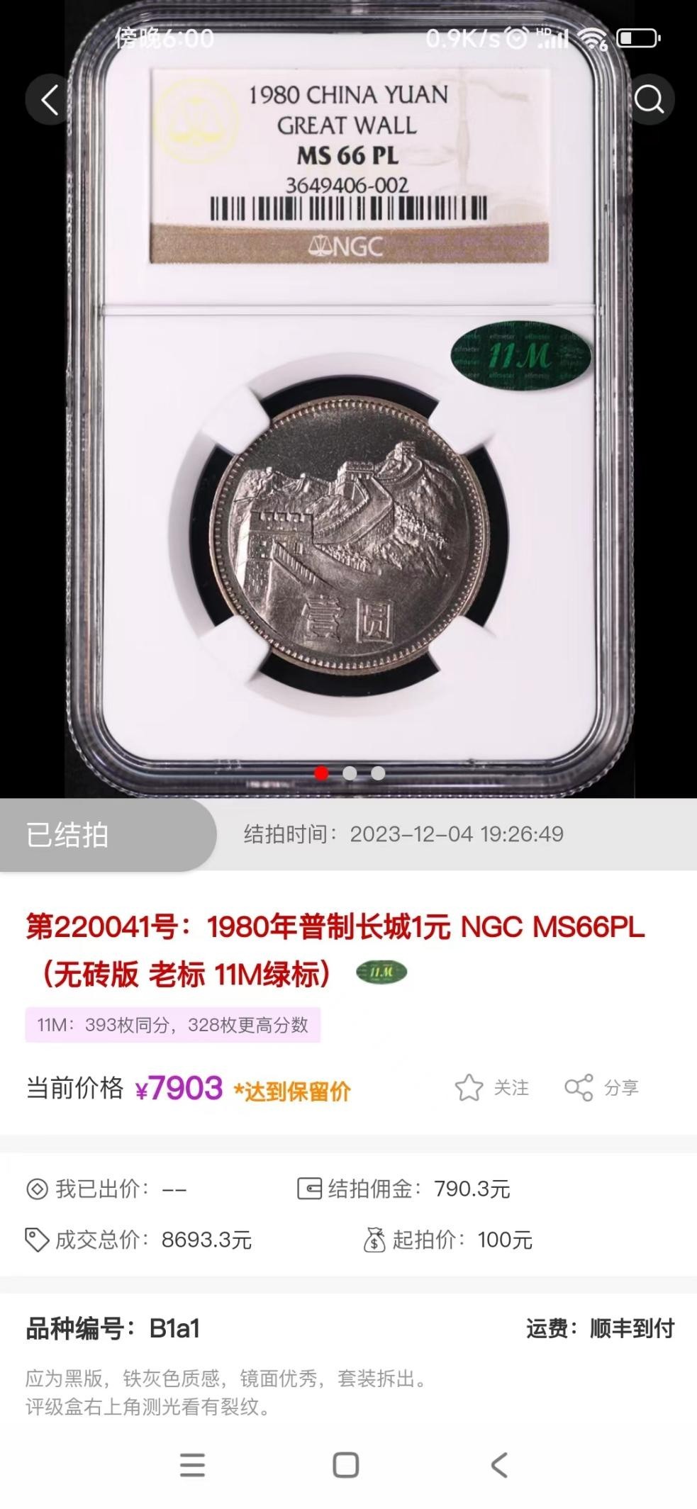 今天我们就把带有镜面标志的这类1980年长城币最新成交价格公布一下,下次再公布。再评级币成交价格,也就是带有再评级标志的长城币成交价格,师友们慢慢等待吧。
