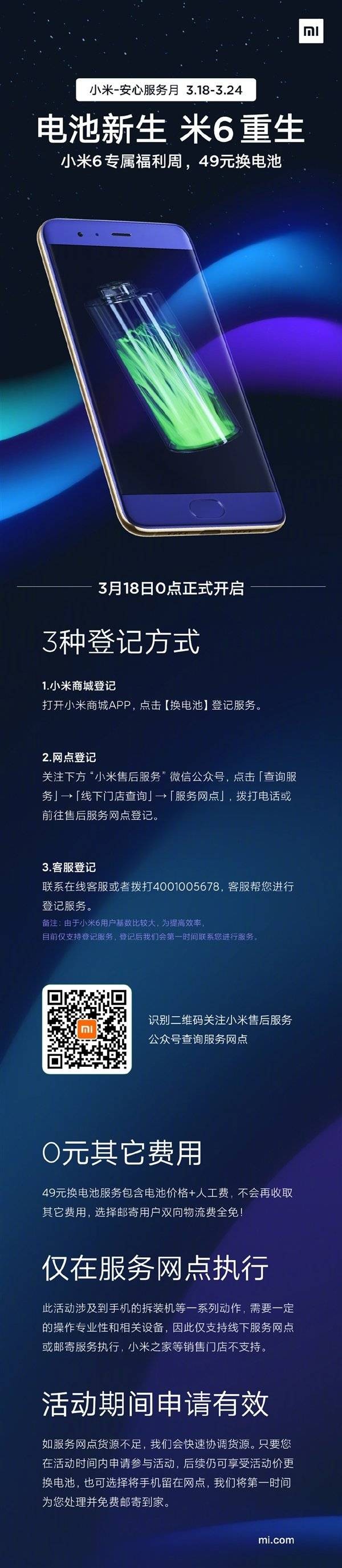 3月17日消息,小米手机官方宣布,3月18日-3月24日,官方设立米6用户专属福利周,专享49元换电池服务。