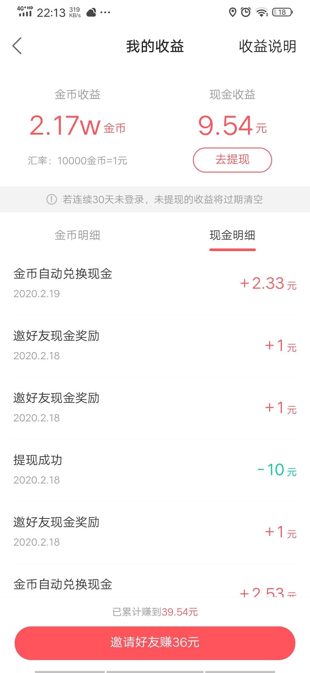 总共收益39.54元,提现了30元