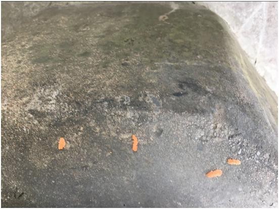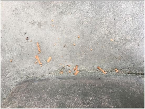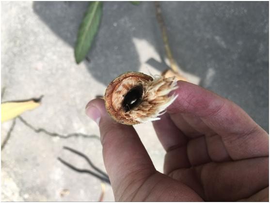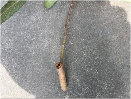 上图就是天牛幼虫的虫粪,其实就是他啃食的木屑结合它的分泌物,因为它的分泌物含糖有一定甜度,所以比较容易引来蚂蚁。所以找天牛的藏身之地就比较容易,一般掉有这些虫粪的地方垂直上去找枝条,会发现一些枝条上有黑色的疤,上面有蜜糖样的分泌物,用工具稍微捅几下就会出现一个洞,这就是天牛的蛀洞,有时从地表到这个洞会有蚂蚁爬上爬下,也能帮助你找到树洞。如果一根枝条上有两个树洞,那一个是进洞,一个是出洞,说明两洞之间的枝条已经被蛀空了,而且天牛幼虫已经出来,转移下一个枝条了。