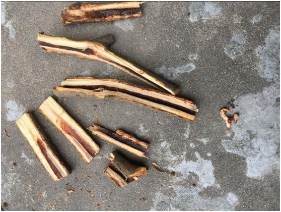 我今天是出于好奇要找到那条天牛幼虫,所以把那根被蛀的枝条整条锯下来,5-10公分的一段一段锯,然后每段对半劈开,如下图