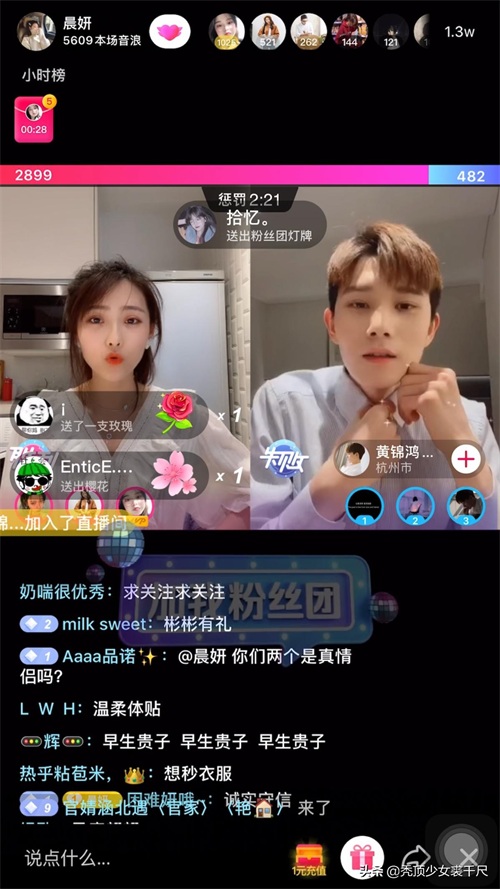直播间里,晨妍与男友花式秀恩爱、各种亲密互动那是一波接着一波而来。晨妍一开始与黄锦鸿视频连麦PK,两人互相说对方的优点直至一方卡壳即为输,结果不出所料是我们的“宠女友狂魔”小黄输了,这里面有没有内幕咱也不敢问!问就是输了的小黄竟然马上来到了晨妍身边,和她同框,两人一起跟粉丝们互动聊天,如此贴心的男朋友请问去哪里领?