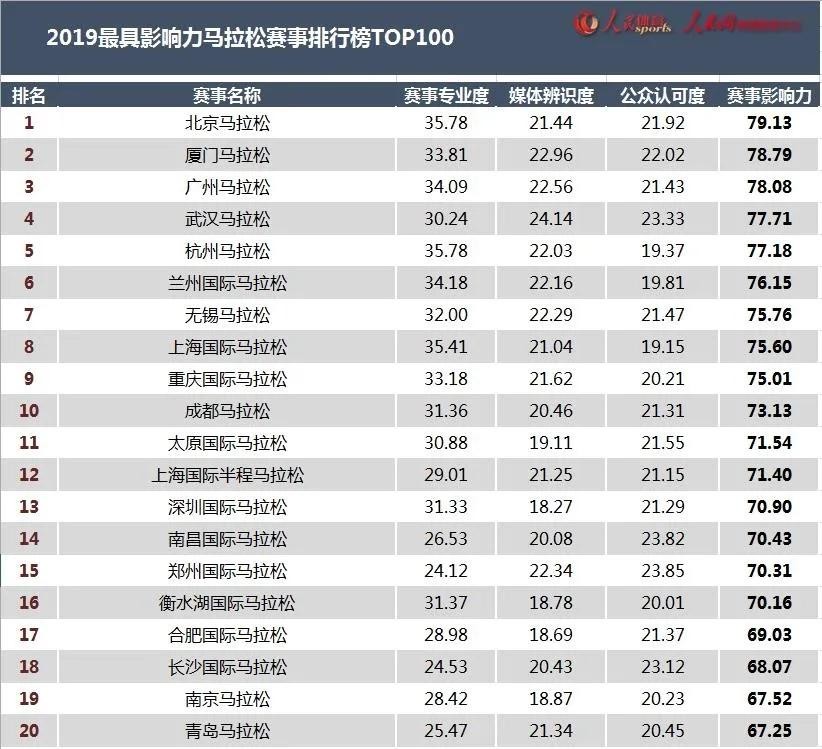 “2019最具影响力马拉松排行榜”TOP100发布,附2015-2018全排名