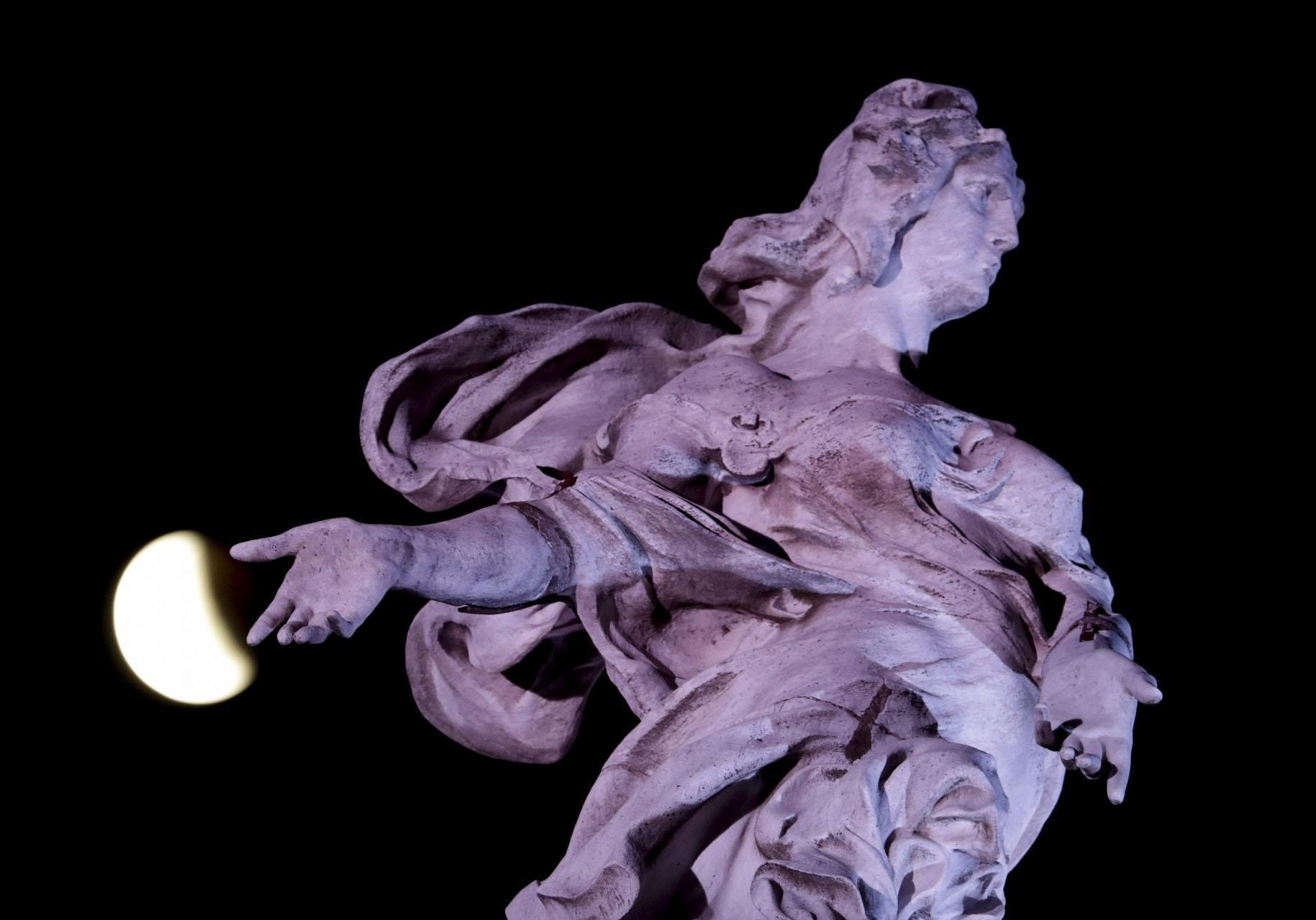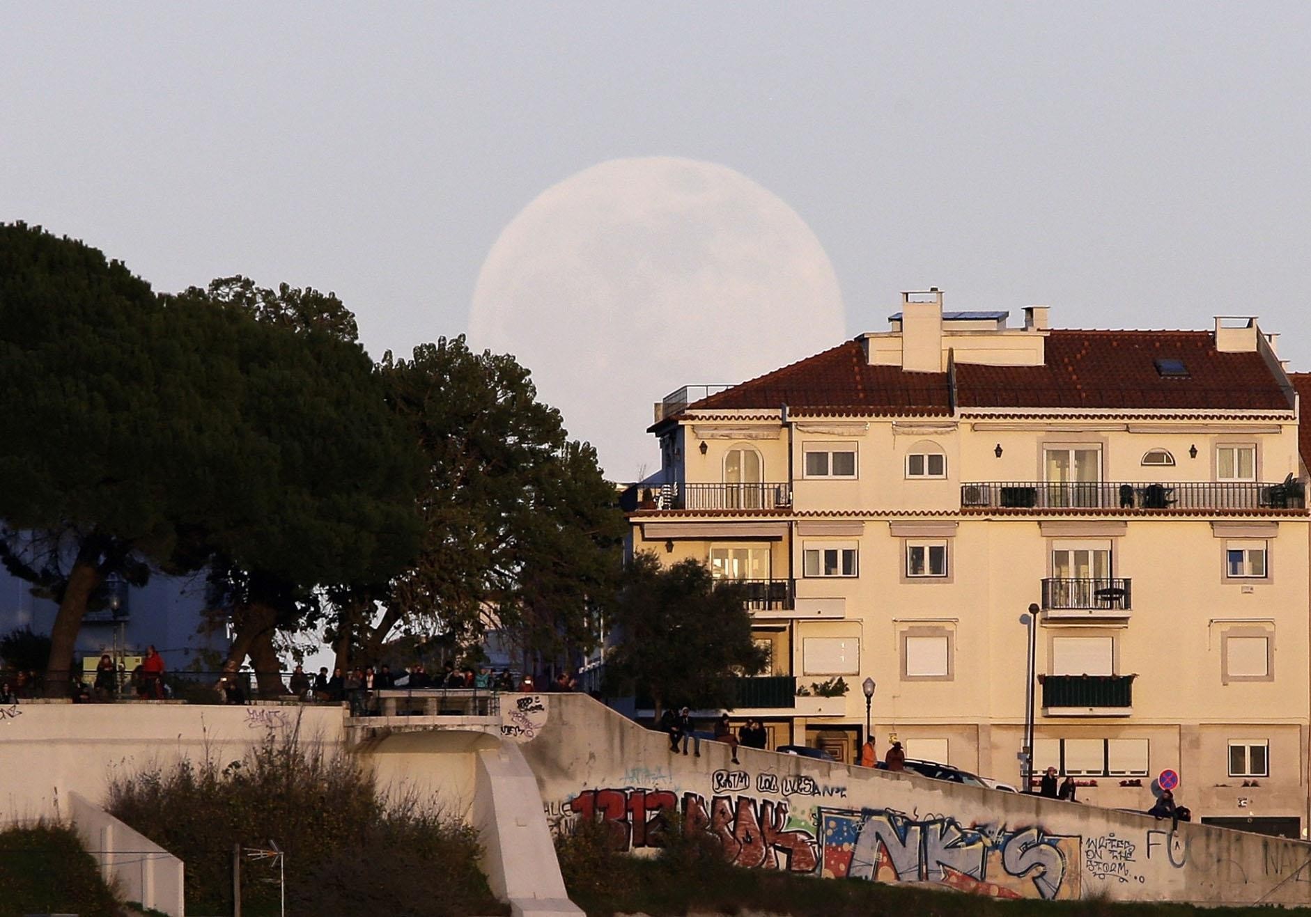 本次超级血狼月历时约4小时,由美东时间周日(20日)晚9时36分到翌日(21日)凌晨1时50分。图为葡萄牙里斯本(Lisbon)民众1月20日拍摄到的超级血狼月。