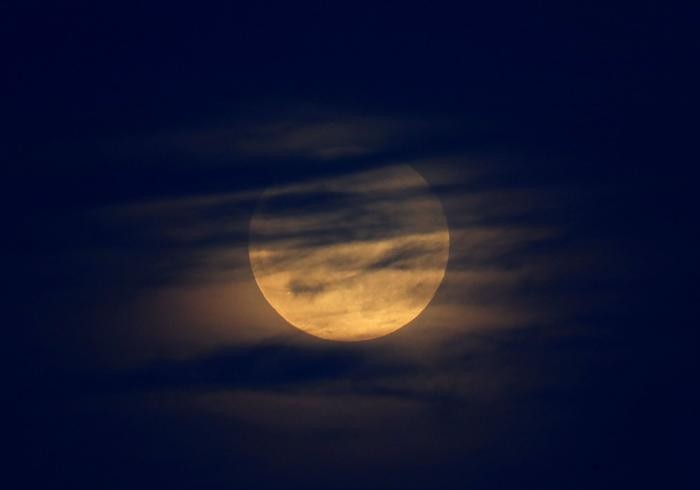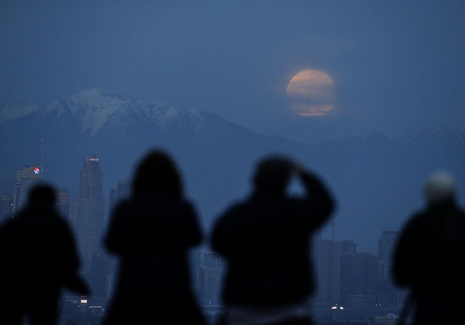 太阳光在经过地球大气层时将蓝色等颜色散射掉,剩下的红光则被折射到月球表面,所以月全食时的月亮看起来是似血的暗红色,又称血月(blood moon)。图为民众1月20日在美国洛杉矶肯尼思哈恩公园(Kenneth Hahn Park)拍摄到的超级月亮。