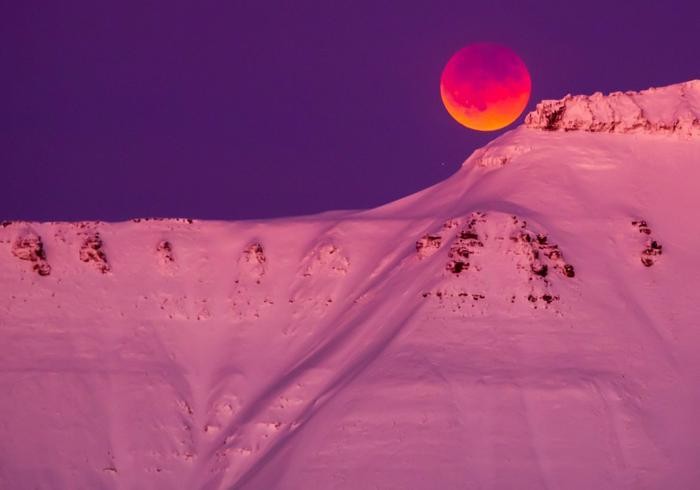美洲、欧洲、非洲及俄罗斯部份民众,抬头便会看到一个又大又亮,甚至呈红色的明月。图为民众在挪威斯瓦尔巴群岛(Svalbard)朗伊尔城(Longyearbyen)拍摄到的血月。