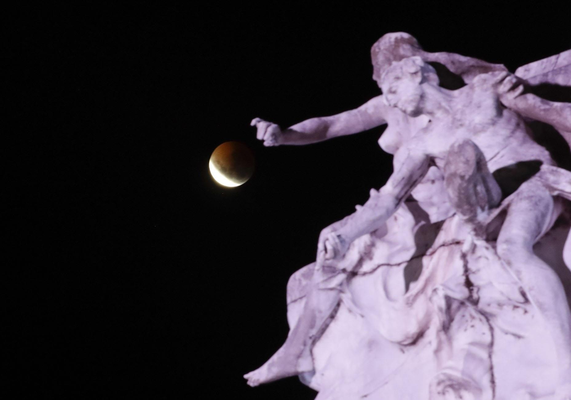 每当月球经过地球阴影时,便会形成月食(lunar eclipse)。图为民众在阿根廷首都布宜诺斯艾利斯(Buenos Aires)拍摄到的超级血狼月。