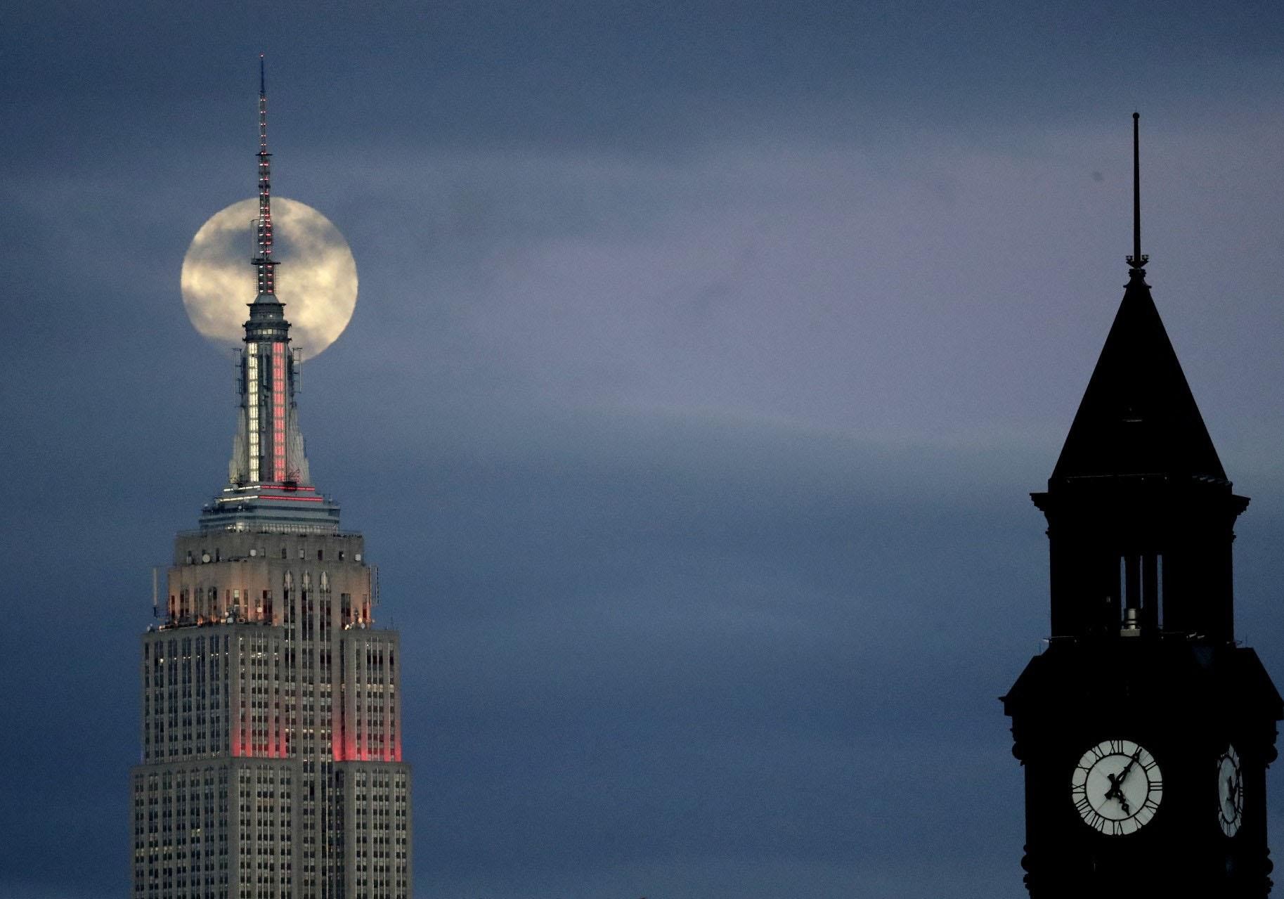 虽然身在亚太地区的朋友无缘欣赏今次的天文奇观,但仍可在网上观看直播。图为超级血狼月从美国纽约帝国大厦(Empire State Building)后面升起。