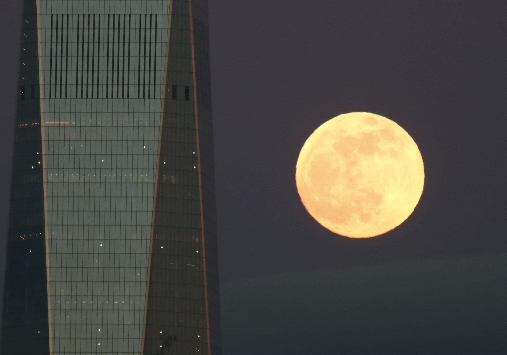 这次月全食只限美洲、欧洲、非洲及俄罗斯部份地区可以看到。图为超级血狼月从美国纽约世贸中心一号大楼(One World Trade Center)后面升起。