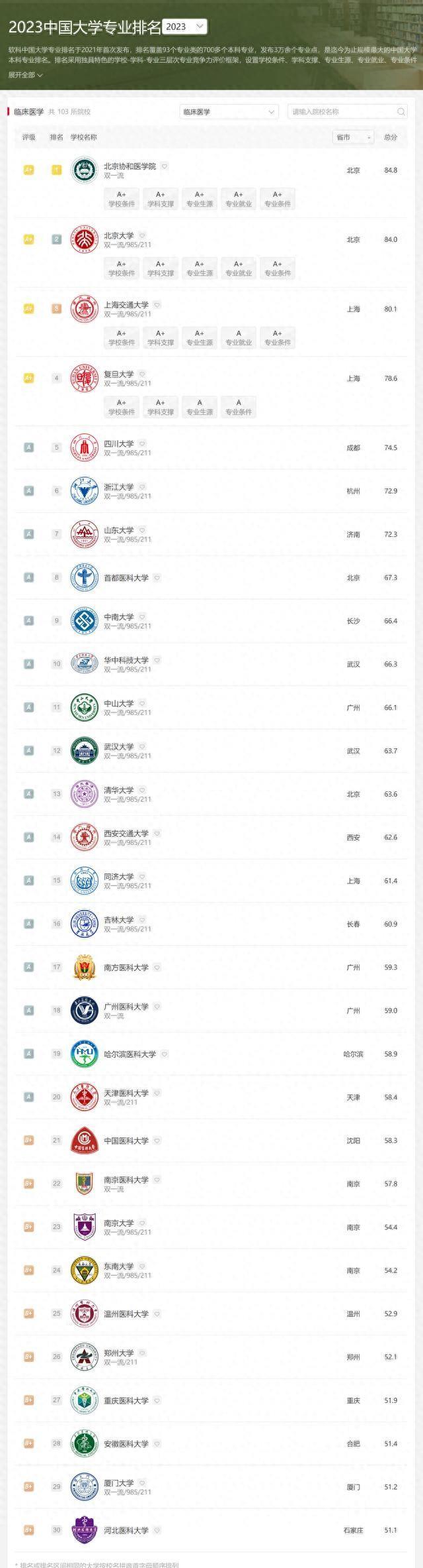 中国临床医学最佳大学30强!哈医大第19、首医第8、协和霸气夺冠