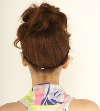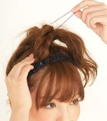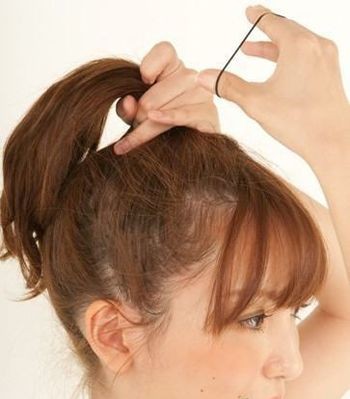 将刘海后侧的发顶头发,用小皮筋固定起来。
