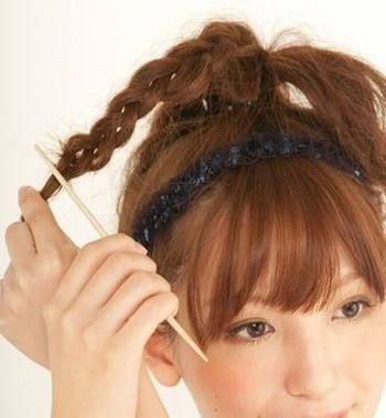 高扎的头发分作数缕,交叉着编几条麻花辫,将麻花辫拉蓬松。