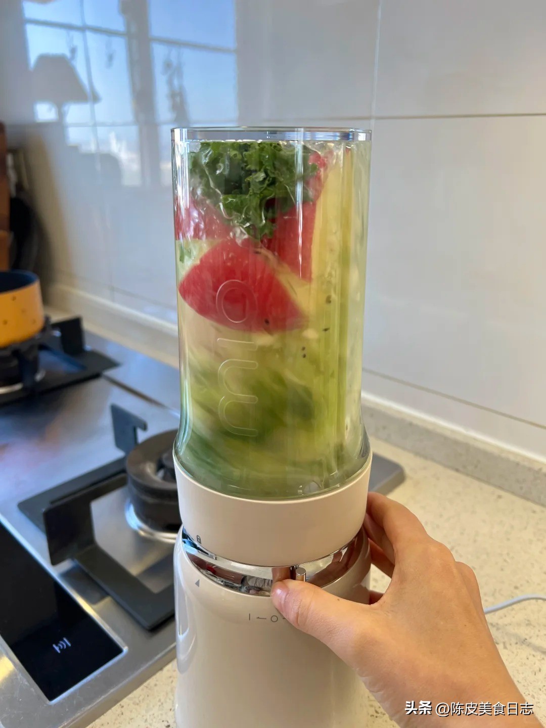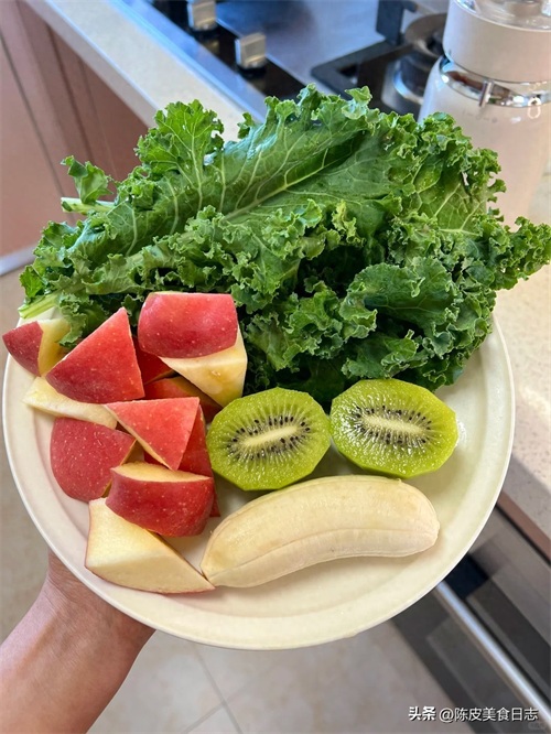 羽衣甘蓝约3片 、苹果半个 、猕猴桃1个 、香蕉1个 、水或椰子水约500ML