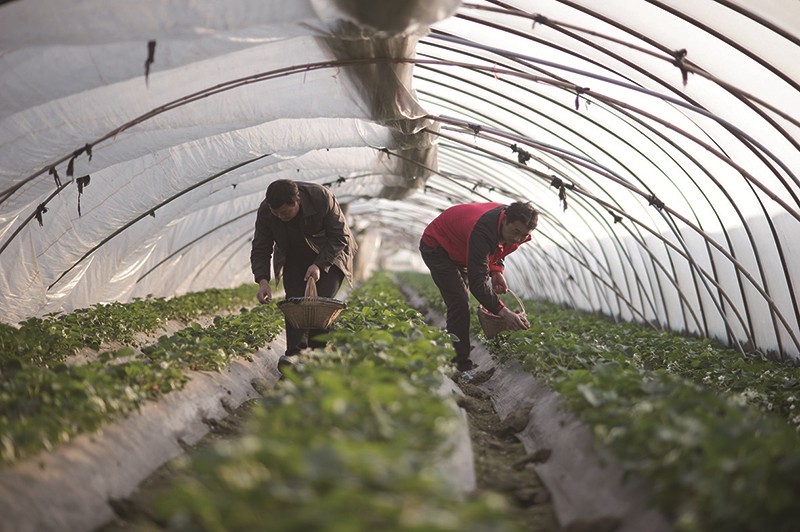 长丰县草莓种植户在大棚内采摘草莓 郭晨 摄