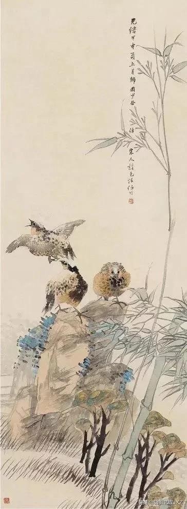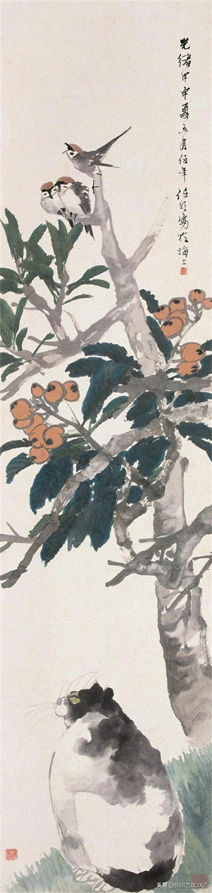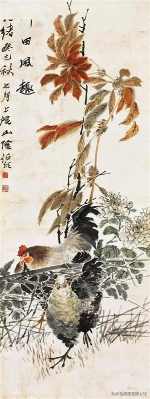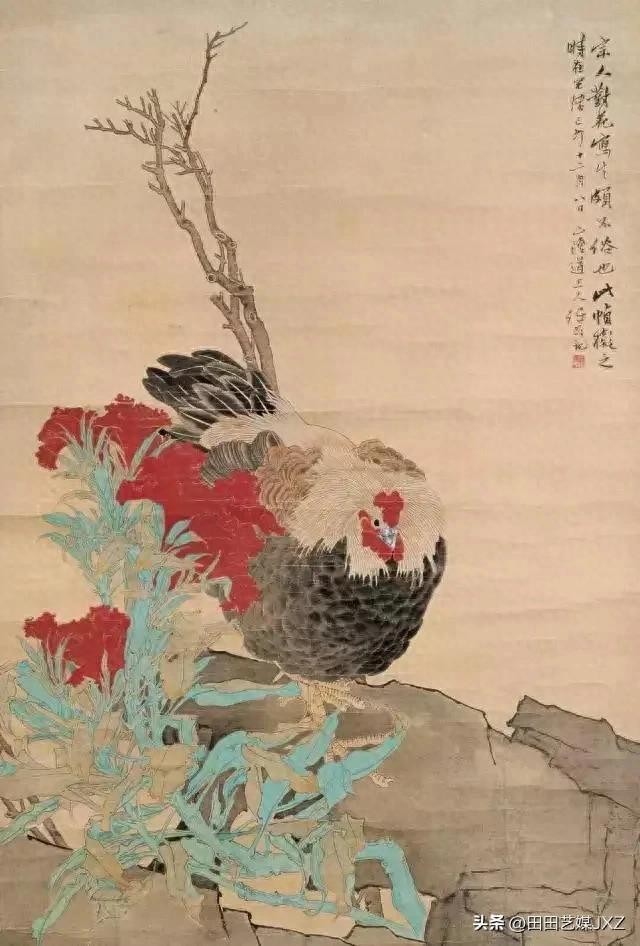 任伯年善于观察生活,从生活中提取创作素材,观察羊、鸡、鸟,进而观察街道上的行人灯尽收笔下。早年的花鸟画以工笔为主,双钩细笔画出轮廓,画后再施以淡彩,设色也是以传统的赭石、花青、石绿色为主,色彩艳丽,有富丽堂皇的感觉,这是晋唐双钩填彩的传统。