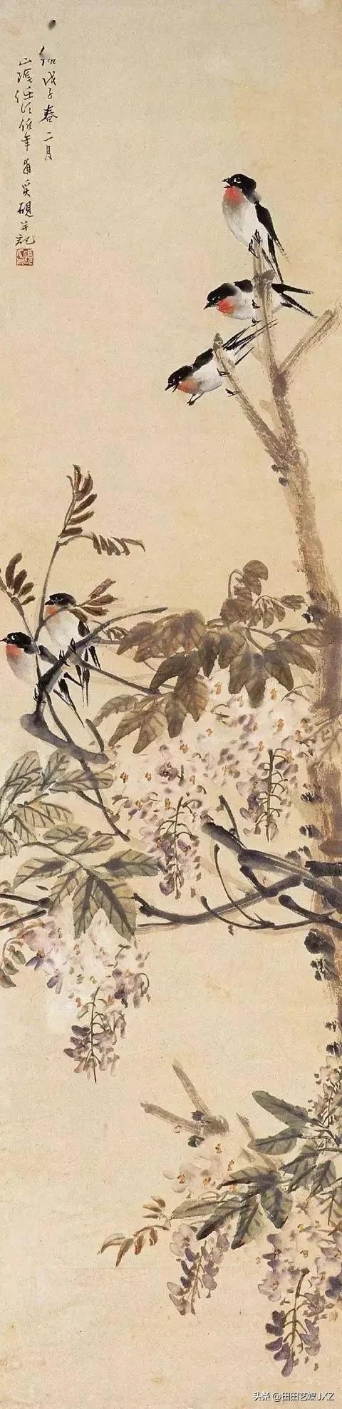任伯年此时期的花鸟画以生动活泼见长,最擅长的就是描绘运动中的花鸟形象,捕捉充满动感和张力的瞬间,使画作上所描绘的对象呼之欲出,充满动感。如燕子往往飞翔在空中,或回旋,或附冲,有时会迎面而来,像马上要破纸而出,这种富于视觉临场感的形象在之前的花鸟画作品中是不常描绘的。他笔下花鸟的姿态没有固定的模式,而是以一种自然天成的原生态状态呈现出来,可以看出任伯年此时期的绘画风格