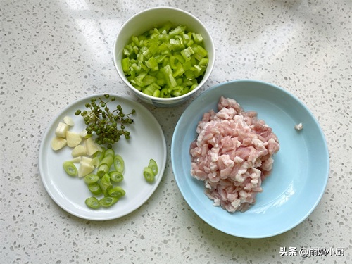 2、把青椒切成青椒粒,猪臀肉切成肉丝,大葱切成葱花,大蒜切成蒜片,装盘备