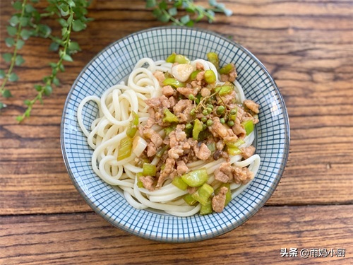 【食材】:猪臀肉200克,大青椒1个,新鲜花椒2串,葱花少许,大蒜2粒,料酒1勺,酱油2勺,豆瓣酱1勺,淀粉1勺,新鲜面条200克