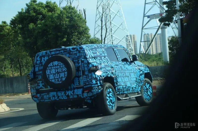 从谍照上来看,新车有着方正的整体设计,车侧线条平直硬朗,轮眉部分很粗壮。车尾部分,后风挡与后尾门接近垂直角度,与整车硬朗的设计相契合,尾灯等细节目前仍采用临时组件。新车整车体型相当巨大,离地间隙非常高,并配备有裸露的外挂备胎,有着很大的接近角、离去角,保证车辆的通过性。新车预计会采用硬派越野常见的非承载式车身。