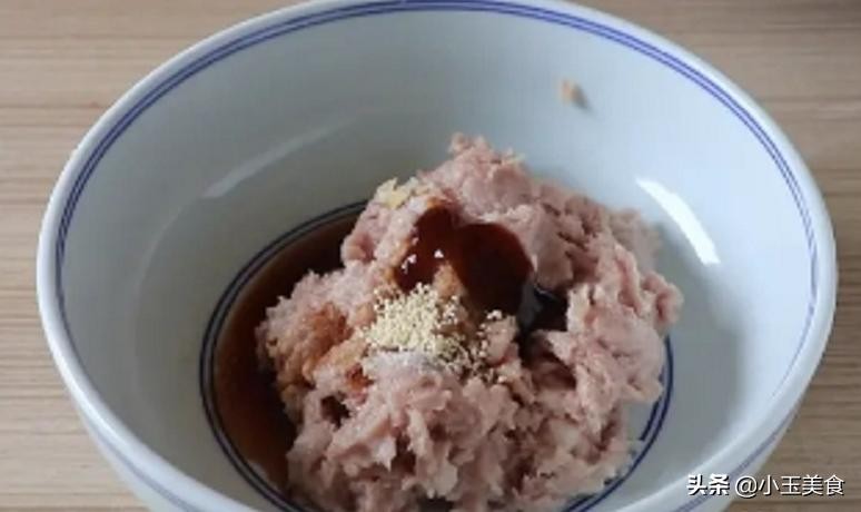 2.准备1斤五花肉,加入适量的盐,1勺白糖,2勺鸡精,2勺耗油,适量的胡椒粉,加入1个蛋清,然后用筷子按照顺时针的方向开始搅拌,在搅拌的同时加入我们事先熬好的料水,料水分3次加入,不要一次加入里面,太多了一次肉吸收不了。放置30分钟。