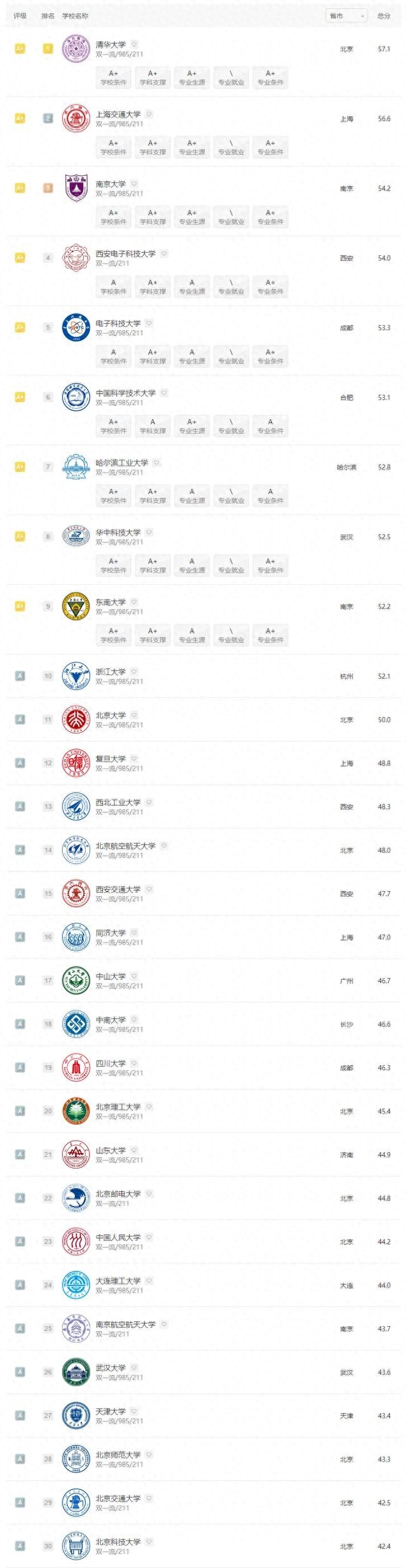 排行榜显示,人工智能专业30强大学为:清华,上交,南大,西电,成电,中科大,哈工大,华科,东南大学,浙大,北大,复旦,西工大,北航,西安交大,同济,中山大学,中南大学,川大,北理,山大,北邮,人大,大连理工,南航,武大,天大,北师大,北交大,北科大。