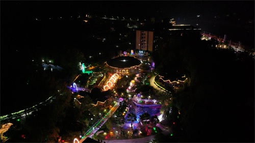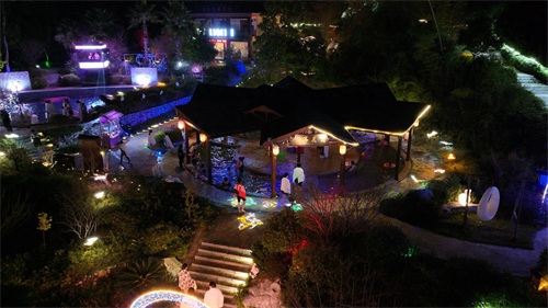 四季花海景区花乐汤温泉有着68个独具特色的森林花海泡池,它们错落有致地分布在葱郁的林木之间。泡池周边,形态各异的动物造型灯盏掩映其中,游客们在花海环绕中享受温泉的同时,还能感受大自然的气息。