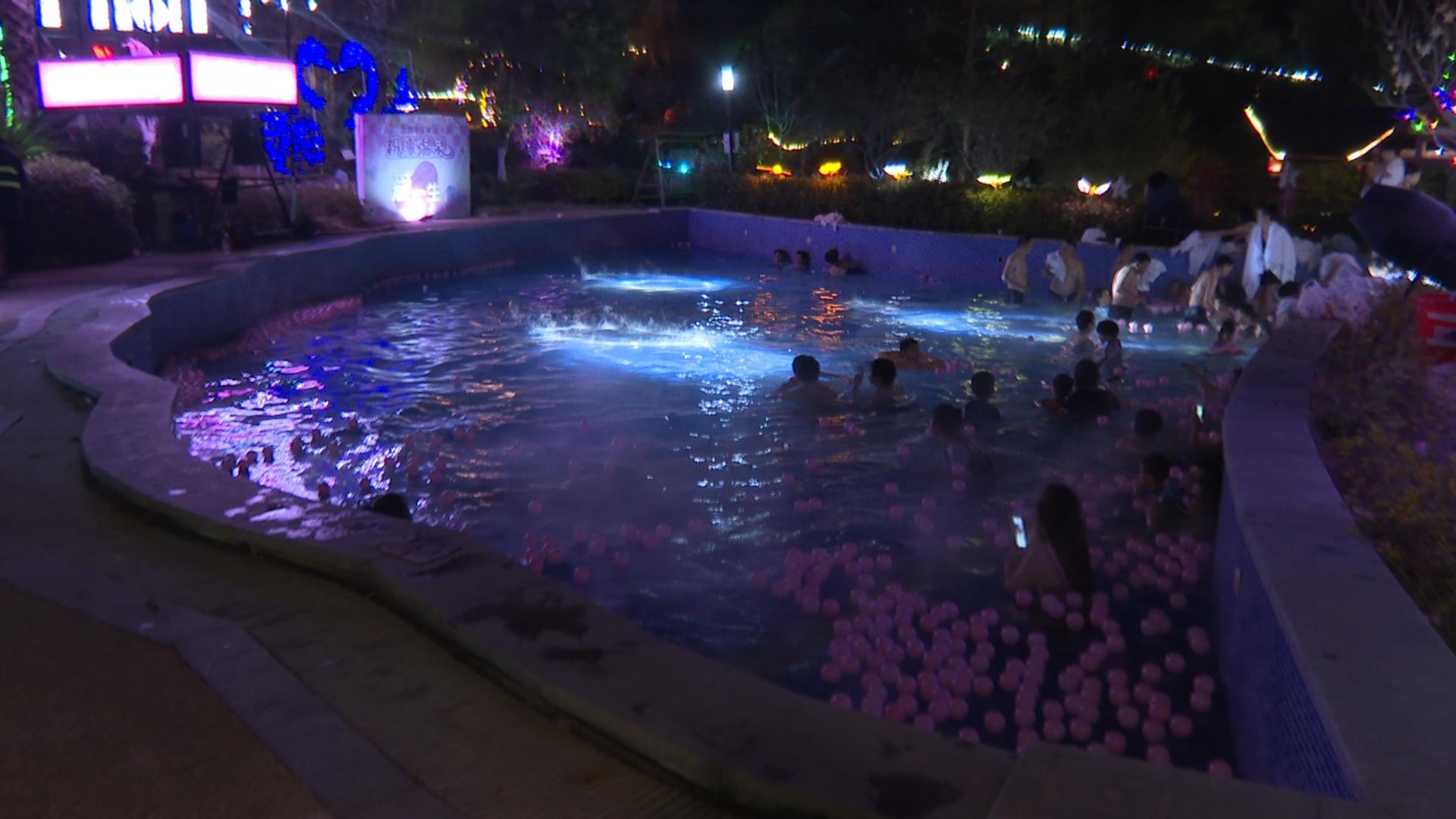 游客 占曦:我感觉这个温泉跟之前我泡过的温泉不一样,像是在花丛中泡温泉,感觉很舒服。还有就是比较有特色的就是灯光,然后温泉的水每个地方都不一样,有的柠檬温泉,有的是小孩游乐的温泉,都可以自由选择。