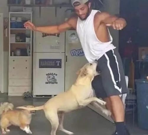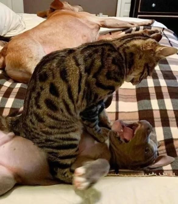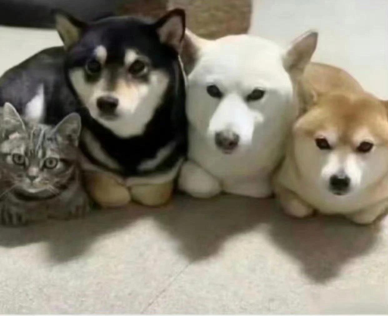 84.这一群猫狗的老大应该是一只柴犬。