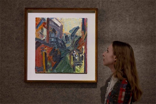 2024年3月18日,英国伦敦,一位拍卖行工作人员站在弗兰克·奥尔巴赫作品旁(IC photo/图)