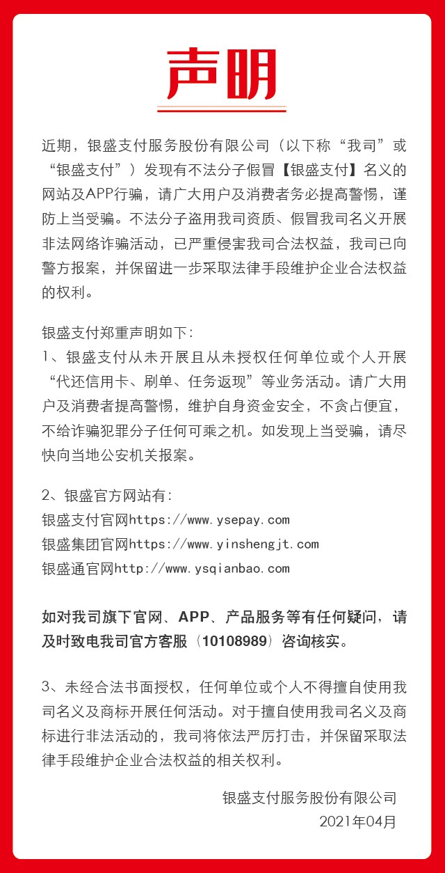 银盛支付郑重声明如下: