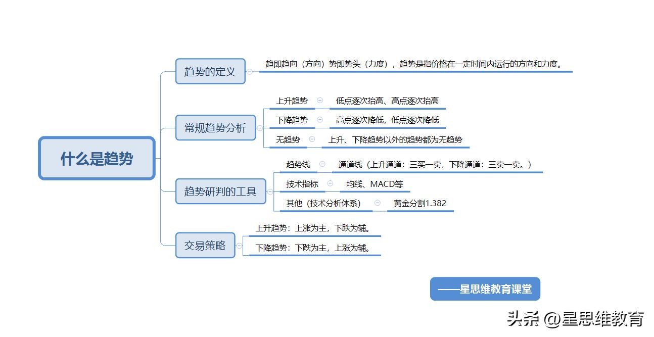 1、趋势就是市场运动的方向。趋势分为两种:上升趋势、下降趋势(震荡不属于趋势)。趋势的类型有主要趋势、次要趋势和短暂趋势三种。说趋势的时候一定要有对应的周期和对应的参照物,趋势永远顺着市场阻力最小的方向运行。