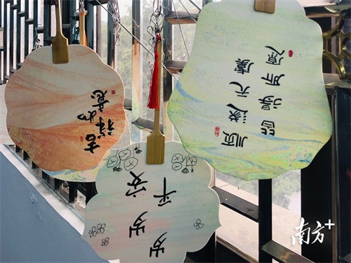 大漆倒水里会漂浮在水面上,轻轻吹气或者用木棍搅动,漆就会自然散开,形成了流动状态的各色“漂流漆”。再将扇子浸于水中,按照“Z”字形缓缓移动、旋转,水波荡漾间,大漆在扇面上留下斑斓的水波纹路。只需要不到5分钟的功夫,就能够收获一把极具“中式写意”风格的漆扇……