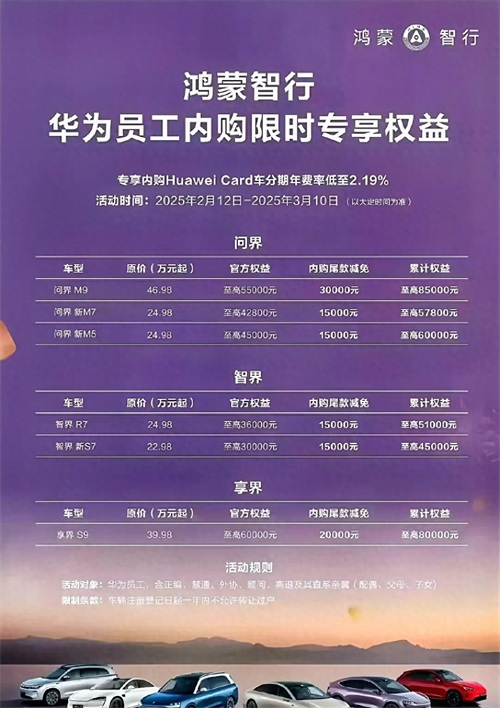 “华为员工买车,最高立减8.5万!”近日,一张鸿蒙智行内部购车权益海报刷爆社交平台。根据政策,华为员工及直系亲属购买问界、智界、享界等车型,叠加官方权益后,问界M9最高可省8.5万元,享界S9省8万,智界R7省5.1万,活动限时截至3月10日。