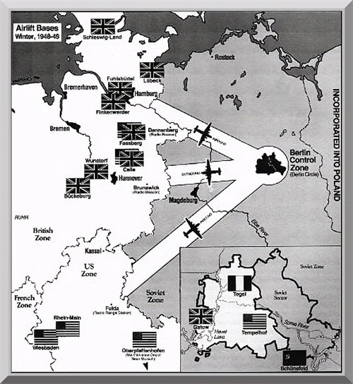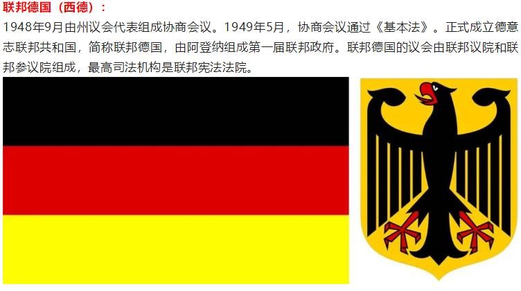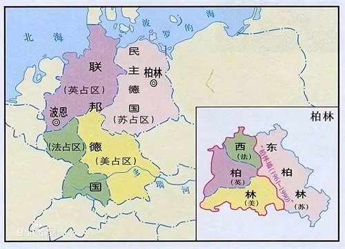 1948年4月,法占区也加入联合经济区。1948年6月,英、美、法三个占领区合并(1949年5月宣布成立德意志联邦共和国,称为西德)。英法美还把占领的柏林市区合成一块,称“西柏林”,并开始发行货币。苏联为此大为不满,出兵封锁了西柏林的交通。