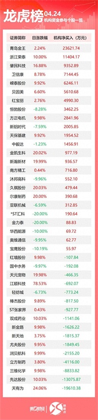 4月24日龙虎榜中,共40只个股出现了机构的身影,有24只股票呈现机构净买入,16只股票呈现机构净卖出。当天机构净买入前三的股票分别是青岛金王、浙江荣泰、肇民科技。当天机构净卖出前三的股票分别是天有为、先达股份、三维化学。