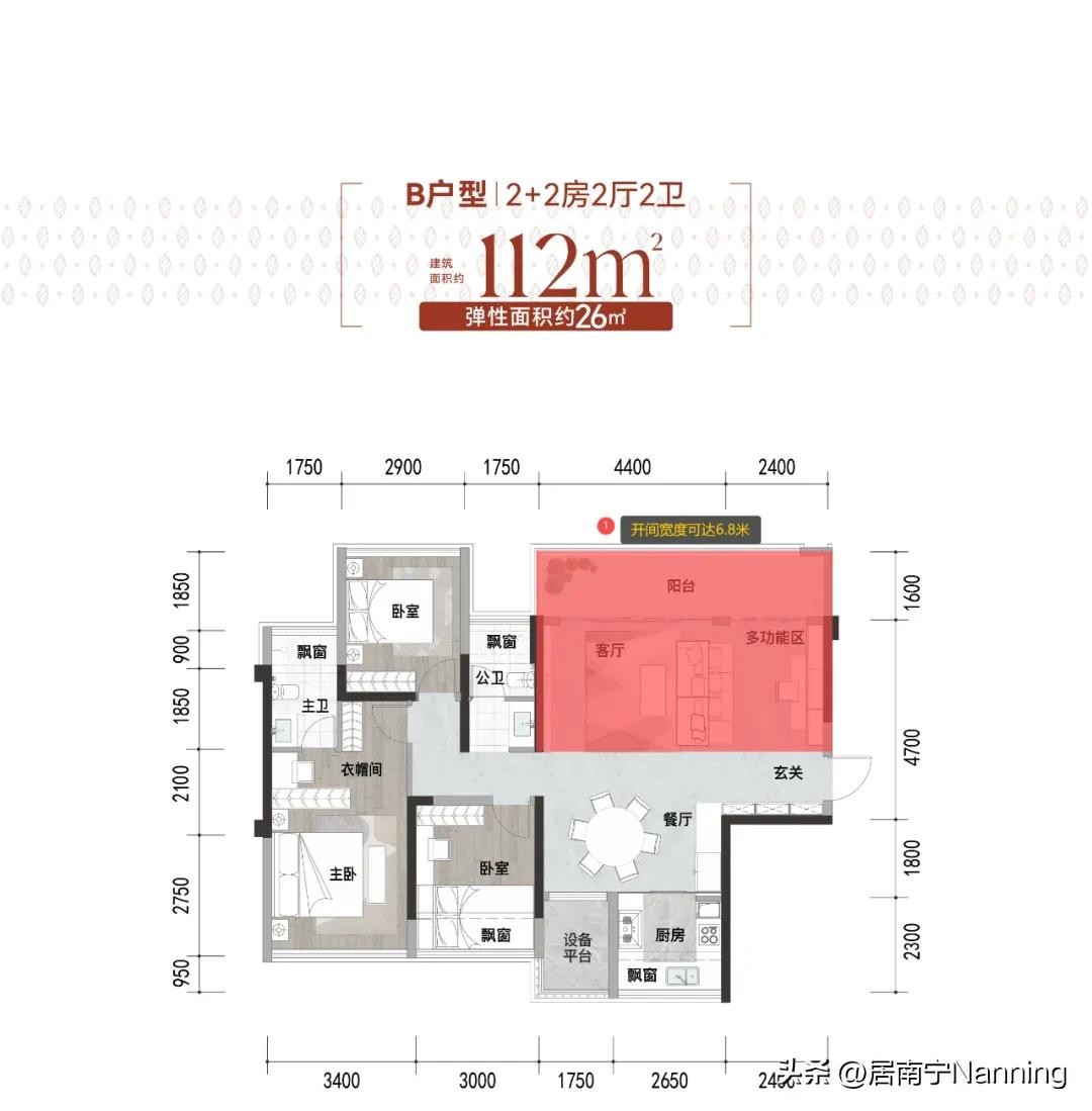 比如建面约112㎡的成长户型,其客厅开间宽度可达6.8米。