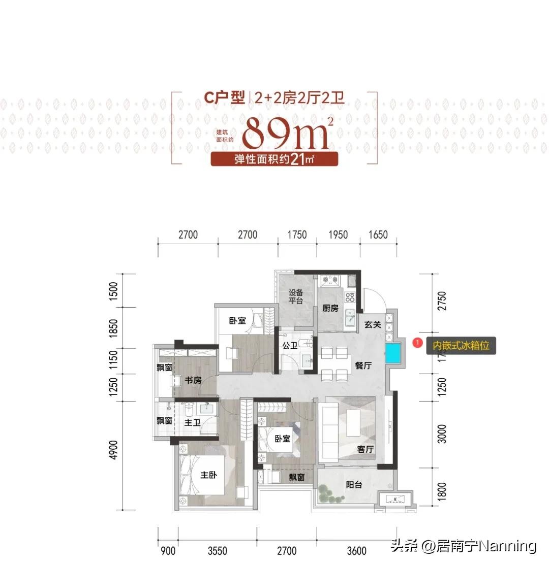 以最小建面约89㎡户型为例,它可以做到4房2厅2卫,放眼南宁,凤毛麟角。