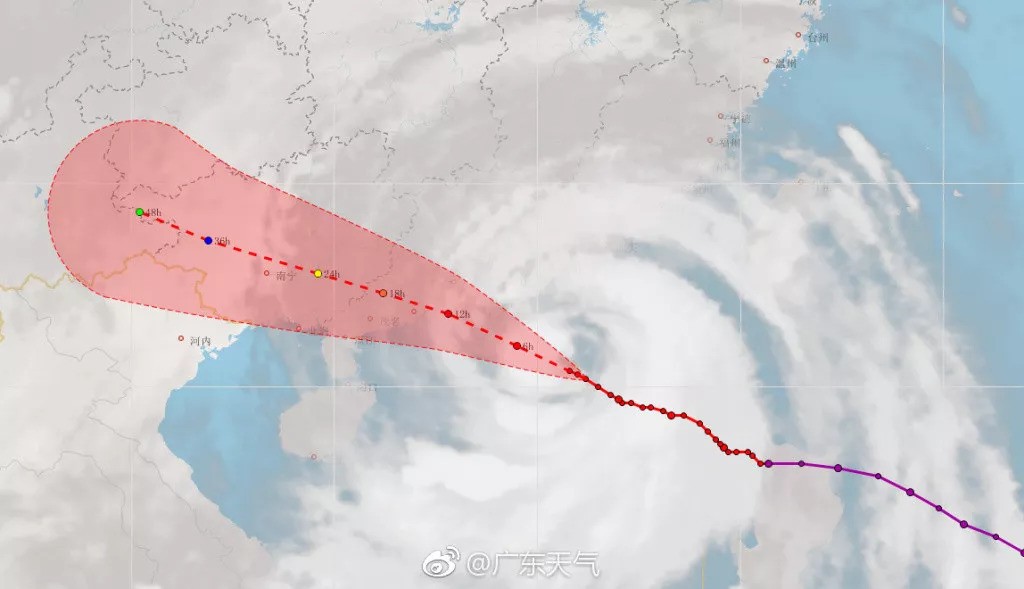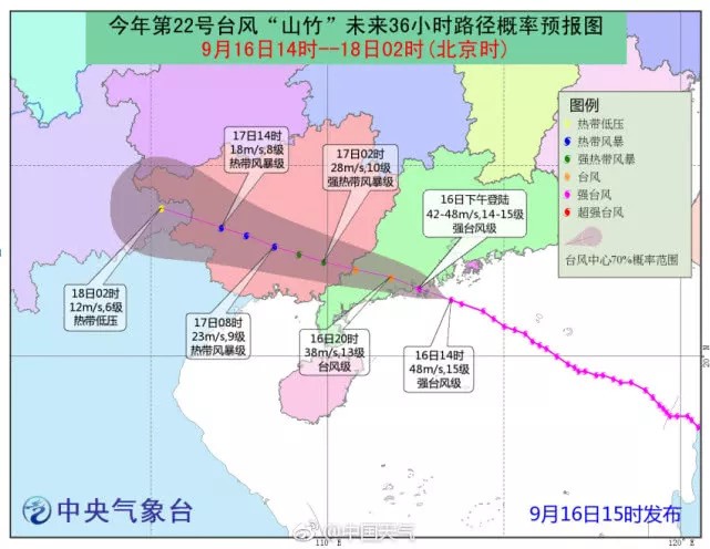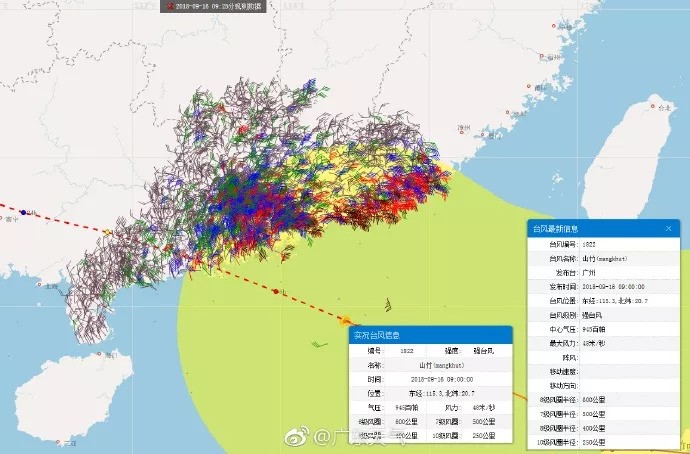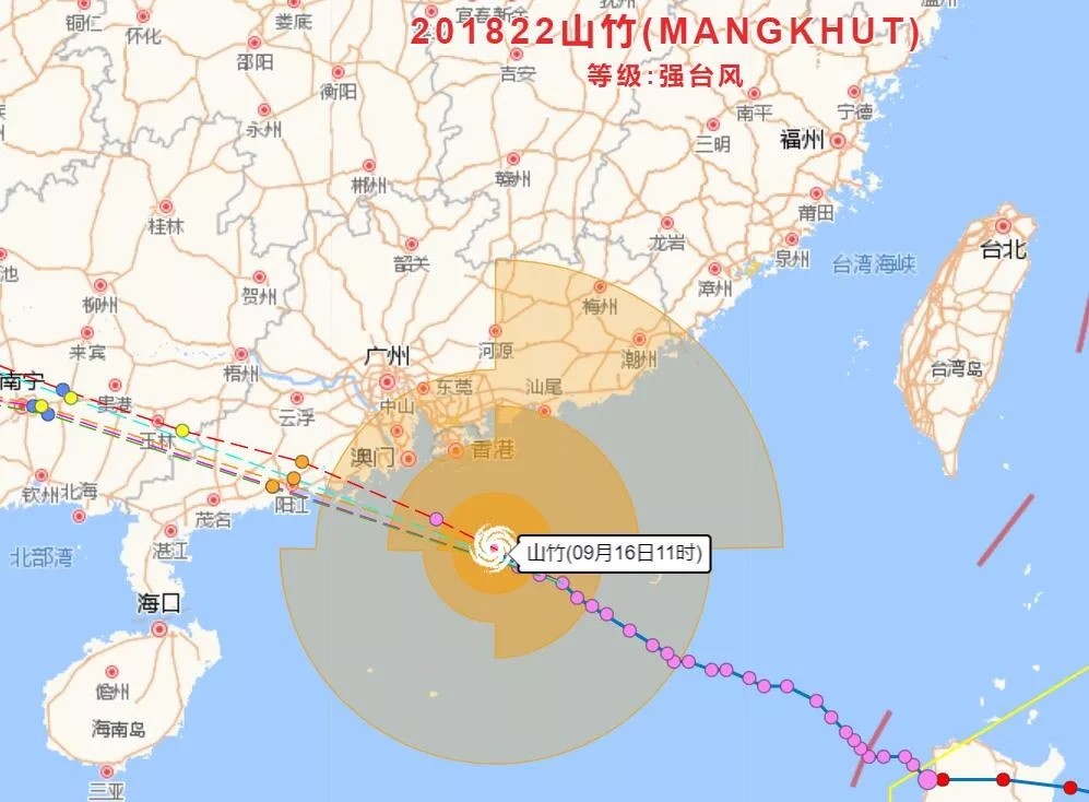 根据中央气象台最新的路径预报,已经将“山竹”的登陆时间提前到今天下午。中国天气分析师胡啸预计,“山竹”最大可能在17时前后登陆台山沿海!