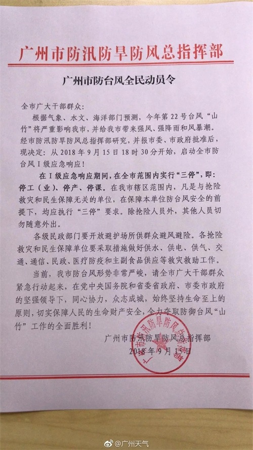 广州市人民政府决定从2018年9月15日18时30分开始,启动全市防台风I级应急响应,除医院、供水、供电、供气、电信等特殊行业,在全市范围内实行“三停”,即:停工(业)、停产、停课。