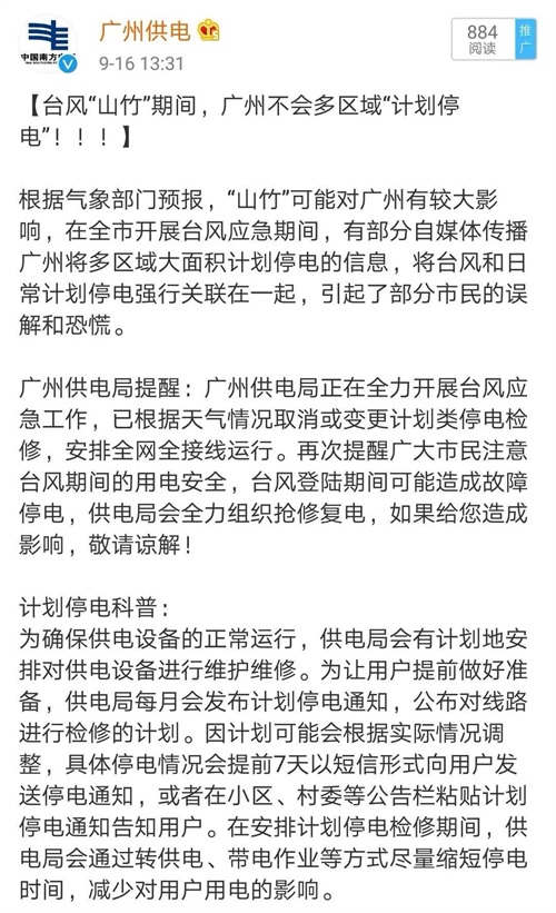 广州市番禺水务股份有限公司:因第22号台风“山竹”带来的严重暴风暴雨可能会引起停电或供水设施损坏,为保障全区市民的基本用水需求,建议提前做好储水准备。